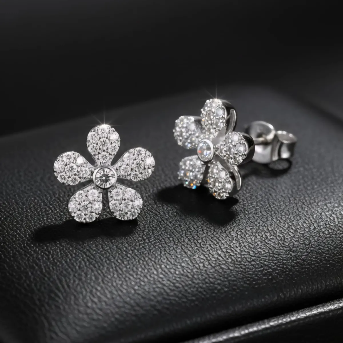 Brinco em formato de flor 5 pétalas cravejado em zirconia cristal. Banho Prata.